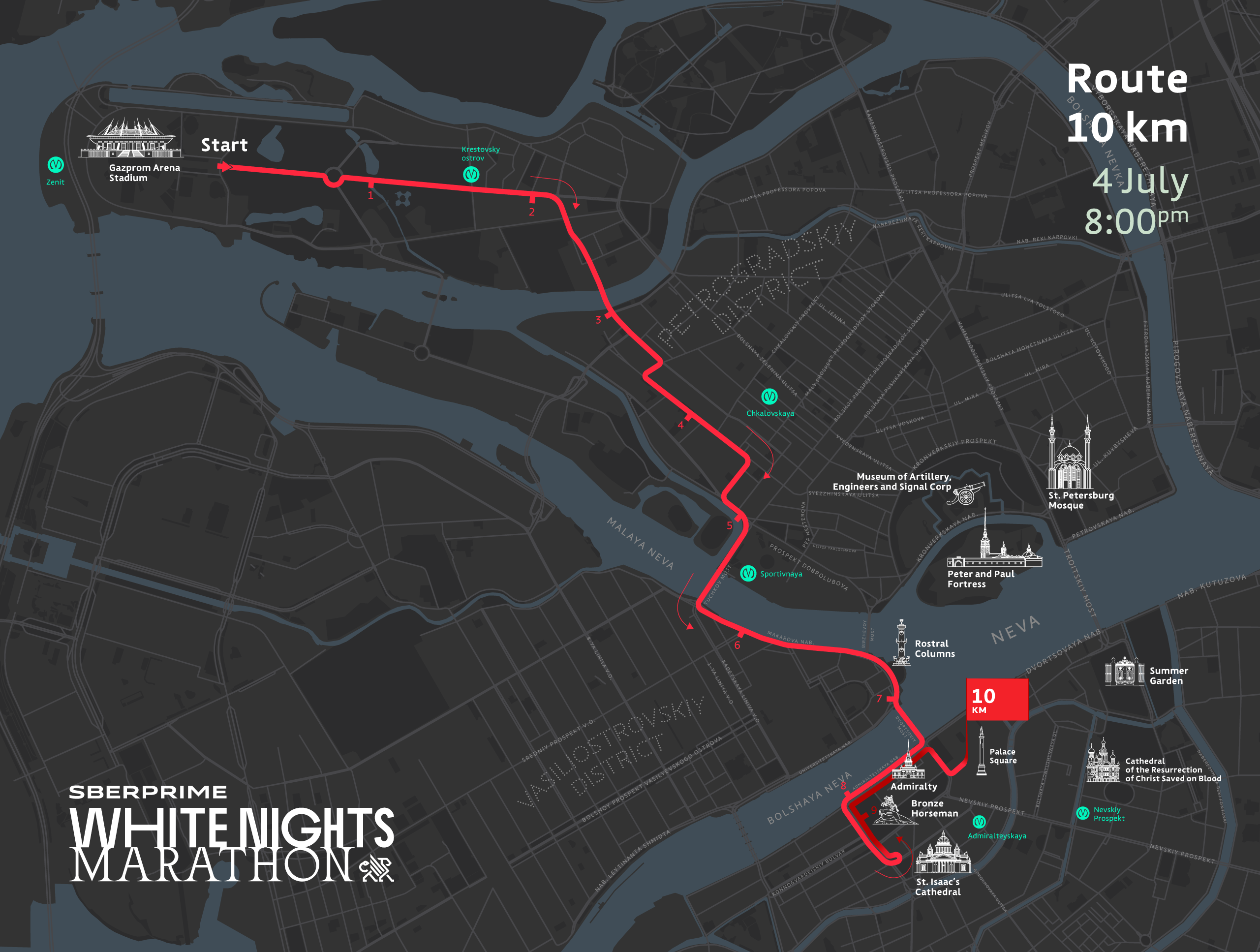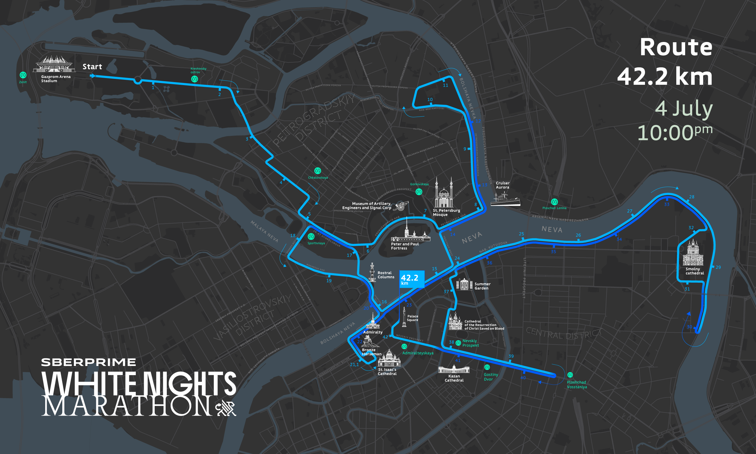 On July 4, head to the finish areas to cheer on the runners. You can also follow their results online at results.runc.run (select “SberPrime White Nights Marathon” and enter the runner’s bib number or last name).